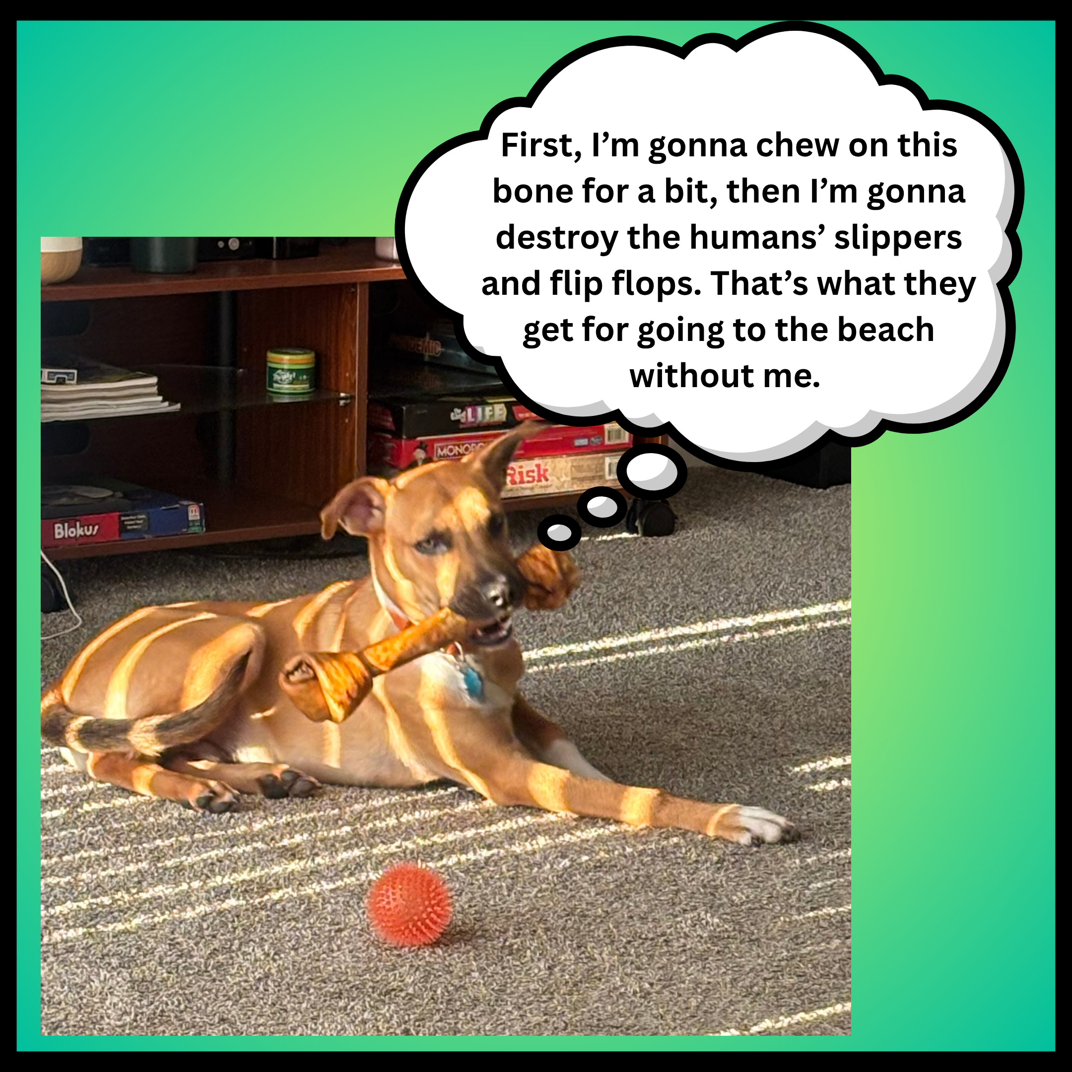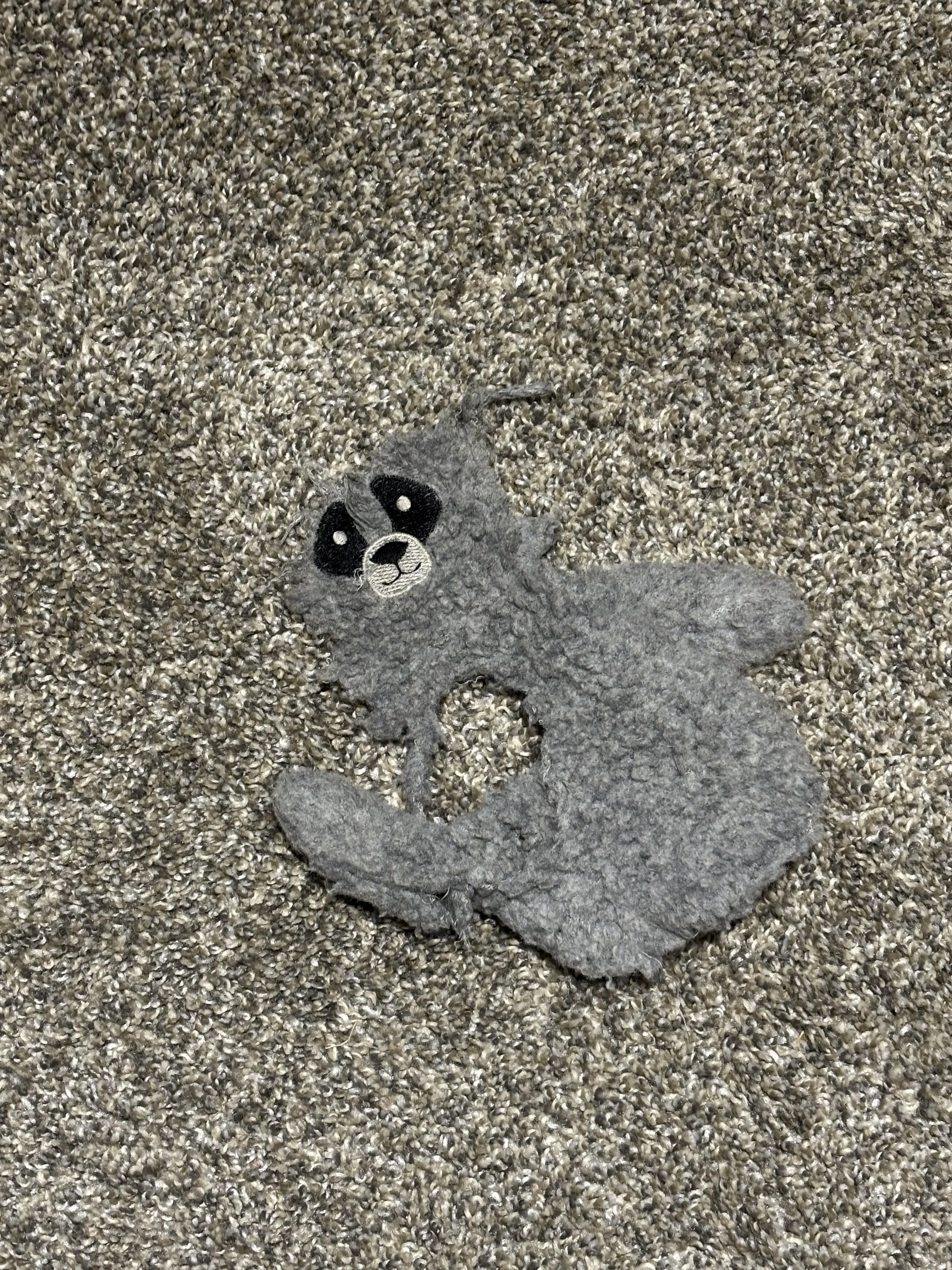 LOL. He likes this rag (picture 1), which he had while in the shelter and a standard plastic bone (picture 2). We learned very quickly that he is a toy, tennis ball, and bed (picture 3) destroyer. Any stuffed toy will last 20 minutes to 24 hours in his hands...errr paws and mouth. For instance, I bought this cow/dog toy (picture 4) from PetSmart the other day, and there were already holes after our 20-minute drive home. There probably would have been more damage to the cow but he dropped the toy on the floor of the backseat and probably couldn't get to it.